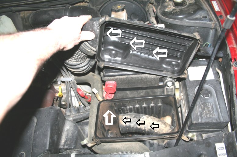 Opened air intake box where the paper or oiled fiber filter element (not shown) would be located. Notice the intake side of the air intake box is dirty and the top is clean. The top is where filtered air passes through on its way to the air duct and then to the throttle body and engine intake. Arrows show path of air flow. This air intake box cleanliness on top shows the effectiveness of the filter element.