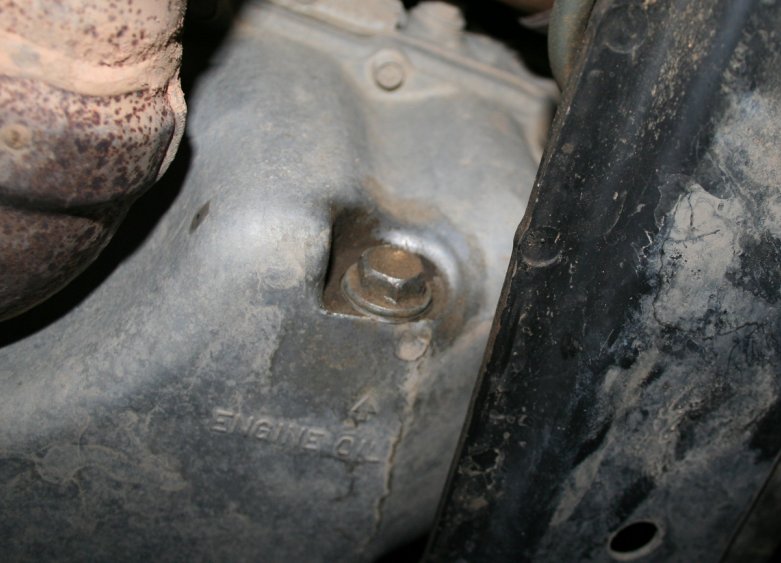This engine oil drain plug (seen from below the oil pan) shows just a tiny bit of seepage which is normal considering this drain plug is removed many times during the life of the vehicle to allow oil to be drained from the engine oil pan.